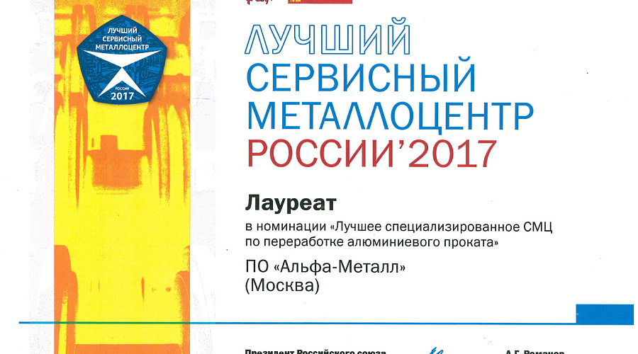 ООО «ПО «АЛЬФА-МЕТАЛЛ» завоевало первенство сразу в двух главных номинациях. Так, ему был вручен Диплом лауреата конкурса в номинации «Лучшая металлобаза алюминиевого проката». А в рамках престижного конкурса «Лучший сервисный металлоцентр России - 2017», в котором было представлено 36 отечественных компаний, стремящихся поделиться собственным опытом развития современной металлопереработки и оказания услуг потребителям проката, компания заслужила звание «Лучшее специализированное СМЦ по переработке алюминиевого проката».